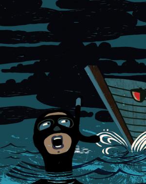 Sean特别想知道他最喜欢的潜点在夜间会是个什么样子。他希望能在他的新潜伴中找到一个人和他一起去,但是当所有人都拒绝了他的时候他依然决定要去看看。他知道不应该独自潜水,但是在水中是如此兴奋让他无法自已。在水面上游回岸边的时候他的耳朵里一直嗡嗡作响。他往回游的时候能看见湖边露营地的篝火,他不时地抬头让自己不会偏离上岸的方向。随后他听到了船马达的声音。