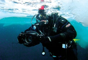 冰潜是一种在极端环境下进行的潜水活动。淡水的冰点是 0°C,海水的冰点依海水盐份含量而定,盐份在25%时,海水冰点为 -1.3°C,盐份在35%时,海水冰点为-1.9°C,盐份越高冰点越低。由此可见无论哪种情况冰潜的环境温度都在 0°C 附近,有时甚至低于0°C。在这种极端环境下潜水稍有疏忽,呼吸器就会被冻住,非常危险。在2008年上海国际潜水展上SCUBAPRO亚太区首席工程师 Derek Lee 就冰潜问题做了专题技术讲座 ,以下就是这次讲座的要点: