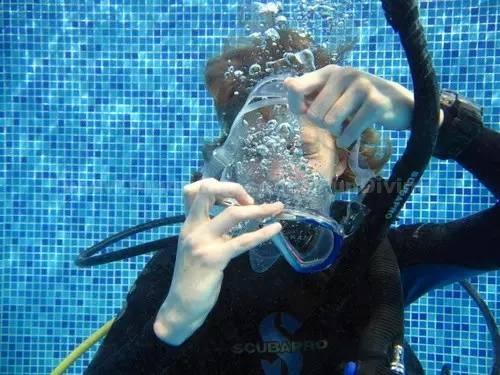 特别大家在做面镜脱下和带回的技巧,在面镜摘除后,我们可以不需要睁开眼睛做,如果你要睁开眼睛的话是看不清楚前方物体,因为我们的眼睛是通过空气进行对焦的,这时不要紧张,保持好自己的呼吸,重新戴回面镜排水即可。