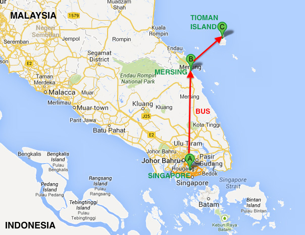从新加坡或吉隆坡乘坐长途巴士到达丰盛港(Mersing),然后乘坐Blue Water Express经营的渡轮前往刁曼岛,渡轮分别在Genting, Paya, Tekek, ABC和Salang几个码头停靠,旅客需要知道预定的度假村所在的码头,以免下错。另外旅客需要注意的是渡轮的时间会根据潮汐的变化调整,了解当天的具体渡轮时间以免错过班次。