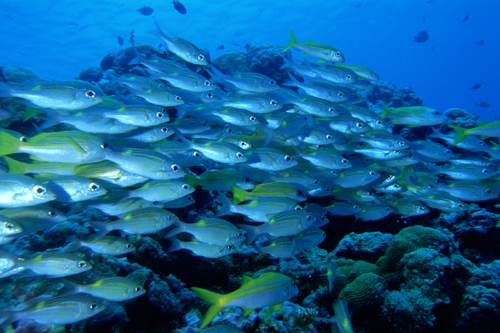 在这里潜水的感觉就像是在水族箱里潜水,珊瑚鱼将你包围着。偶尔可见成群的海狼,象耳。水底放置了一些铁架和跑步机。我们戏称为游乐场。