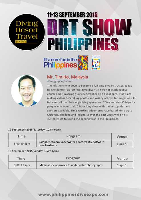 Tim在2009年时成为全职潜水教练,如今他称自己为“专职潜水人”。他不是在教潜水课程,就是在制作视频;不是在制作视频,就是在拍摄照片以及为杂志写文章。在过去的几年中,Tim先后在马来西亚、泰国和印尼工作过,目前,他准备在菲律宾度过未来的一年。 大师作品: 演讲时间: