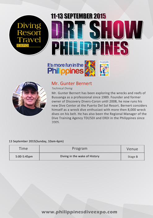 从1989年开始,Gunter就一直致力于沉船与珊瑚礁探索。目前他在菲律宾经营着自己的潜水度假中心,同时他也是TDI/SDI/ERDI的菲律宾区域代理。 大师作品: 演讲时间: