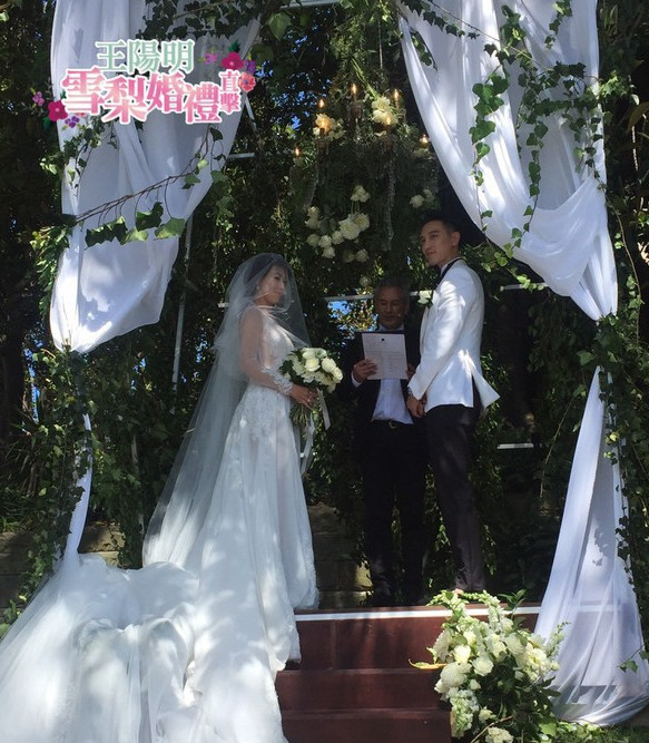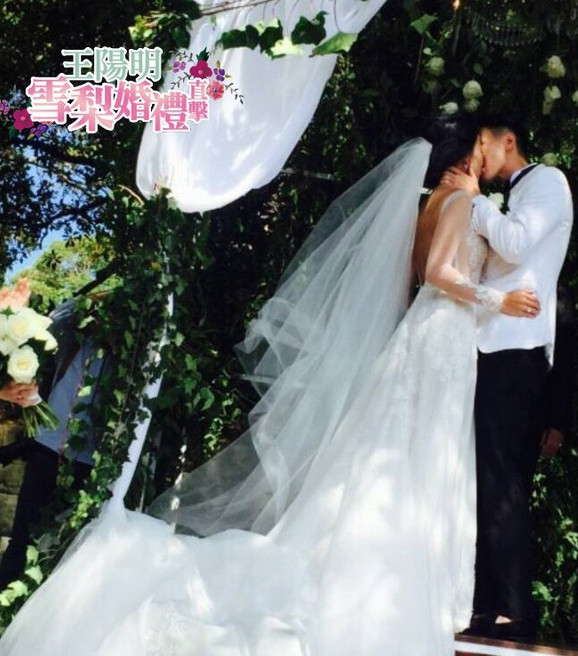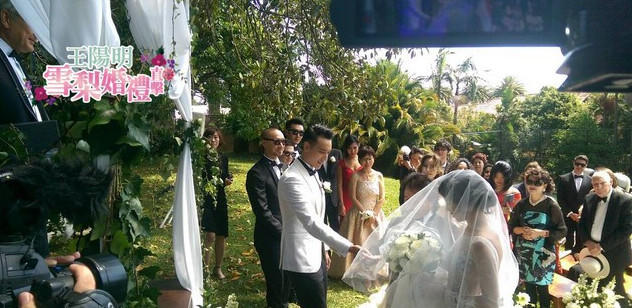当地下午3点整,在花童和伴娘入场后,新娘蔡诗芸乘坐白色马车入场,全场响起掌声和尖叫,蔡爸爸牵着她走完白色长毯,把新娘交给王阳明。接着由牧师证婚,新人一边哽咽一边念完誓词,然后交换戒指,王阳明一吻长达6秒,接着又亲吻一次,完成仪式,全场欢呼见证。