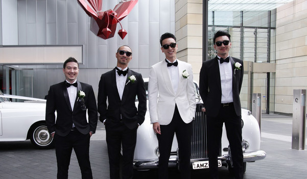 王阳明(右二)与伴郎乘劳斯莱斯礼车出发到现场。