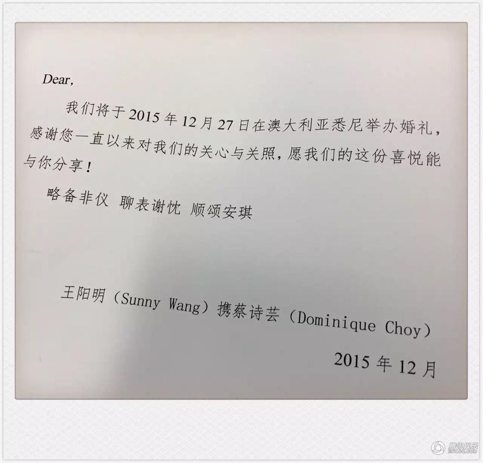 王阳明与蔡诗芸婚礼的请柬设计也颇为简洁大方,白纸黑字十分典雅,而手礼则是名牌巧克力和高级化妆品。