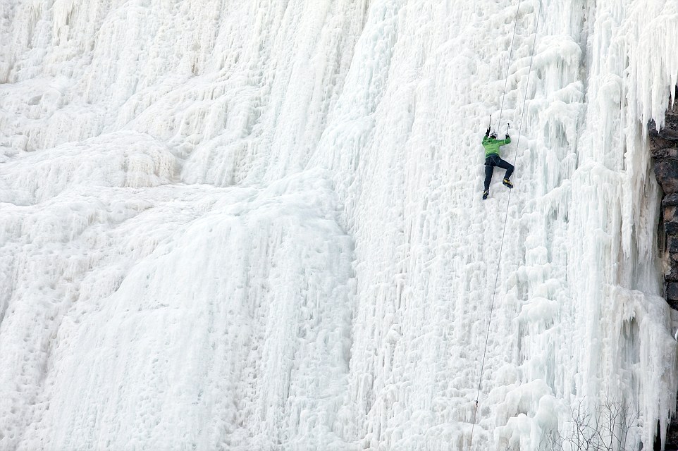 攀爬冰封瀑布的探险者