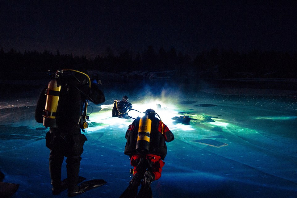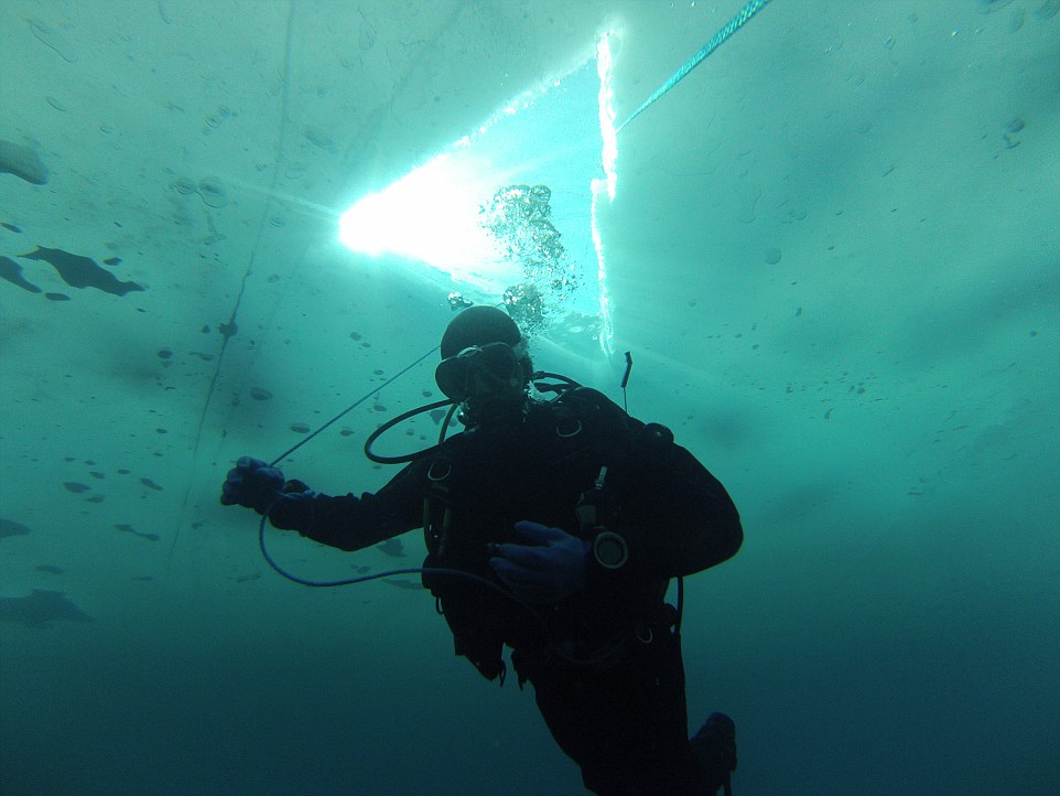 探险者由冰冻的湖面上凿开的洞口潜入冰冷的湖水中工作