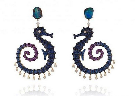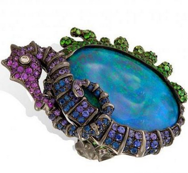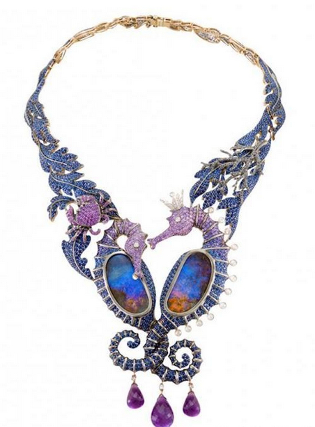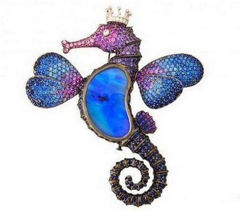 她把灵感焦点放在了深海,以海马和螃蟹做为主题,她将海马描绘成穿着珠光宝气的王者,佩戴着王冠,高高在上的俯视着一切,螃蟹则精巧可爱的挥舞着大钳子游走在周围。蓝紫色宝石与蛋白石交相呼应,营造出一种深邃的渐变色彩,打造出一个梦幻般的海底世界。