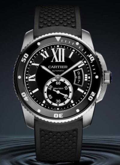 卡地亚卡历博潜水表表壳厚度只有11毫米,加大尺寸的夜光罗马数字时标XII非常能够代表这一系列的设计。这款腕表符合潜水表的所有国际标准,并在表背刻有“Diver’swatch300m”(潜水腕表300米)字样。此外,这款潜水表也有单向旋转表圈以及夜光显示等功能。