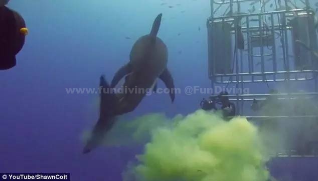 但是即便是这种在海中处于食物链顶端的生物,它们在水中也会遇上自己不愿意让人知道的尴尬。据当时的潜水员称,一开始他们在水下安静地观察着一只大白鲨并且进行拍照,不知道是不是由于闪光灯的缘故,这条大白鲨突然变得很愤怒,并且还从自己的身体里排出了一堆黄绿色的液体,由于当时潜水者都处在笼子里,无奈他们只能站在原地默默地忍受这些排泄物。不幸的是这条大白鲨向潜水员排泄之后并没有满足,它还直接游到了保护铁笼的上方,试图咬开铁笼,好在最后有惊无险。这段视频上传到网上之后受到了很多网友的喜爱,甚至有网友戏称,大白鲨可能当时想方便,但是潜水员们总是看着它,所以就生气了。