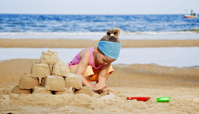 尽管让孩子带着小工具在沙滩上尽情发挥天才建筑师的才华吧,爸爸妈妈只管安心地享受阳光与海滩就足够了。