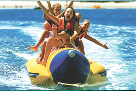 与家人共乘香蕉船。 随着船体穿越水面时的冲击大声尖叫。
