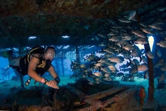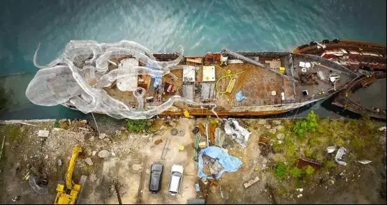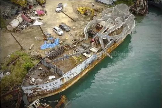 这两天同样在这片群岛,他把其中 Virgin Gorda 南部海域上的一艘二战时期战舰 Kodiak Queen 号沉入海底,打造成了一个人造海洋生态系统,命名为 B.V.I Art Reef,并在船上放了一个 80 英尺长的海怪雕塑,成为这个世界级潜点的一部分。